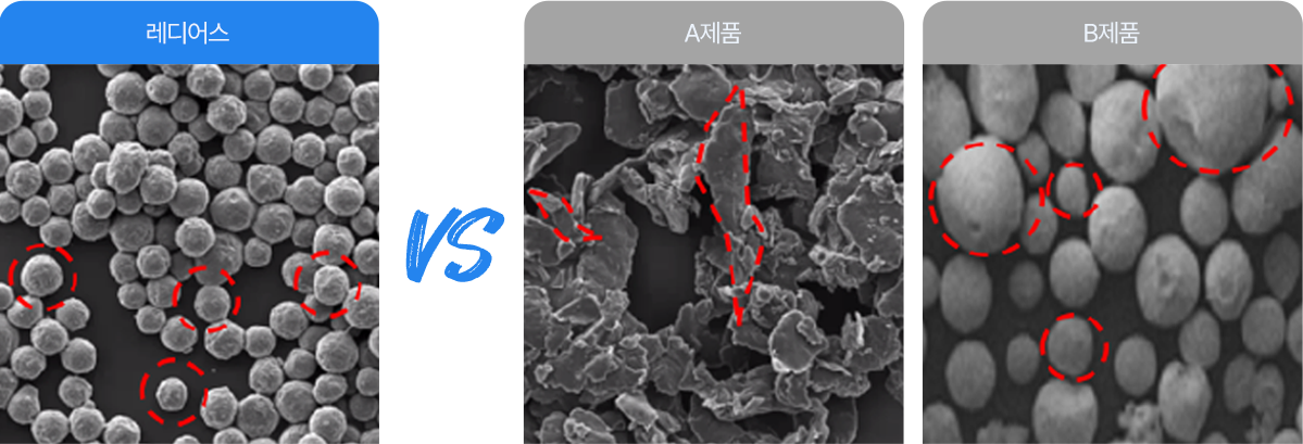 레디어스는 일정한 크기와 매끈한 표면의 입자 형태로 염증 반응 위험성이 거의 없는 반면
