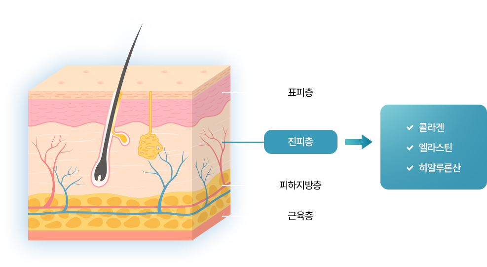 피부의 구조 중 진피는 피부 탄력 감소 및 주름 생성 등에 결정적인 역할을 합니다.