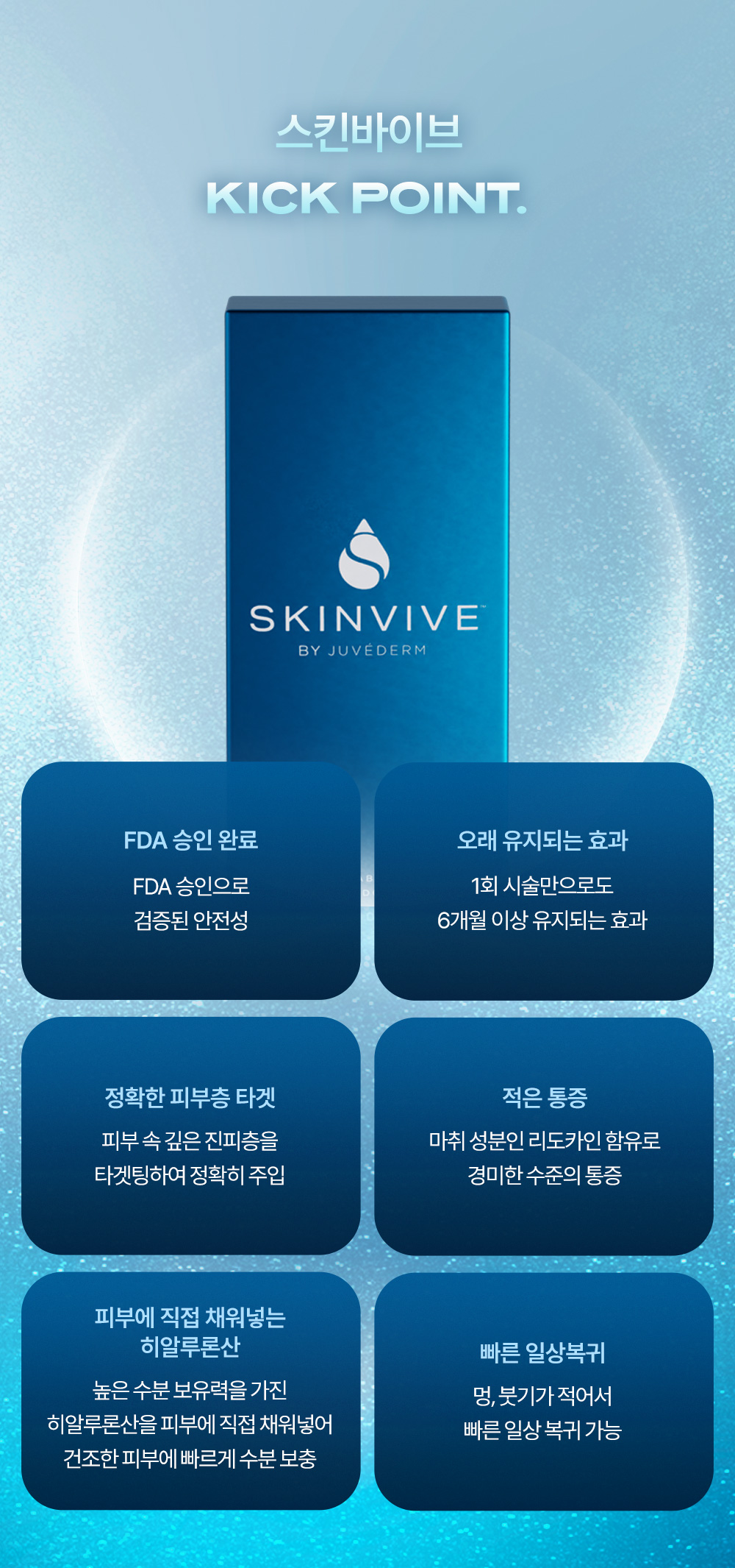 피부 진피층 내에 직접 주입하여 즉각적으로 수분을 공급해 줌과 동시에 미세 주름, 피부결, 탄력을 개선하며