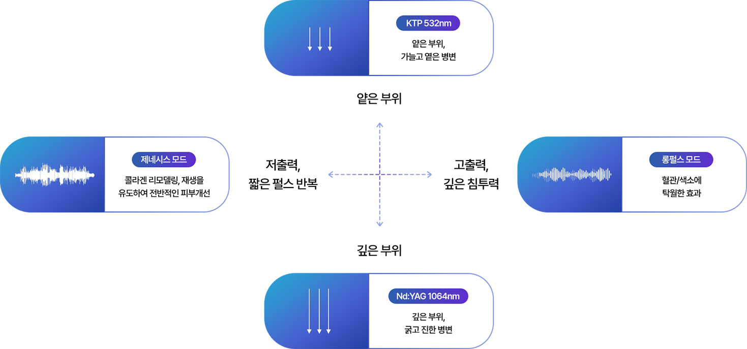 듀얼파장+듀얼모드를 모두 지원하는 GV레이저는 532nm 파장 / 1064nm 파장 / 롱펄스 모드 / 제네시스 모드를